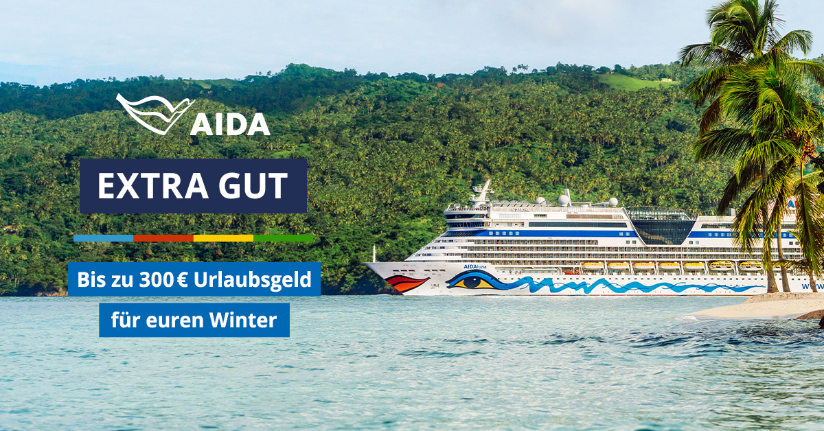 Ob Sommer am Mittelmeer oder Winter in der Karibik, wir versüßen Ihre Auszeit mit bis zu 450 € Urlaubsgeld für schöne Extras. Einfach bis 23. März buchen und den Aktionscode URLAUBSFREUDE auf myAIDA einlösen.