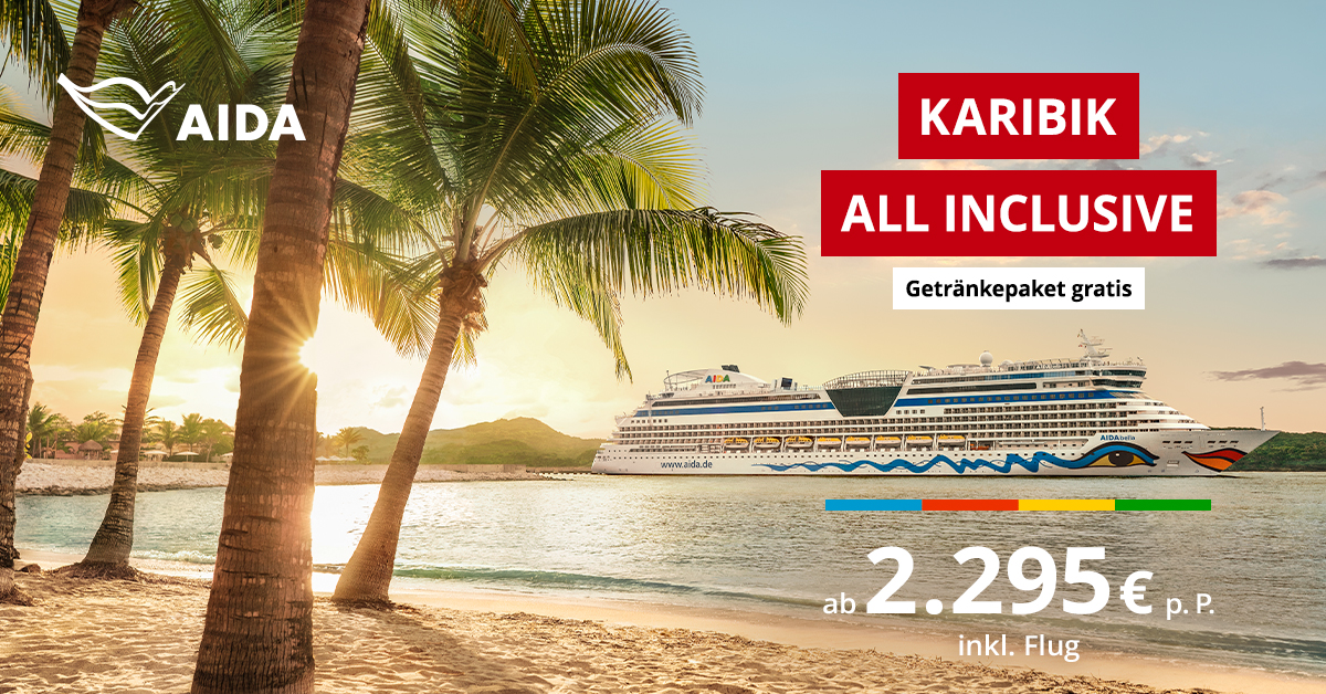 Zum Valentinstag wieder Rosen und Pralinen? Schenken Sie sich lieber Zeit zu zweit auf einer AIDA Reise im Frühling! Jetzt ab 499 € p. P. buchen und 50 € Bordguthaben sichern. Mehr Genuss, weniger zahlen: Auf ausgewählten Reisen genießen Sie unser umfangreichstes Getränkepaket ALL IN zum reduzierten Preis.