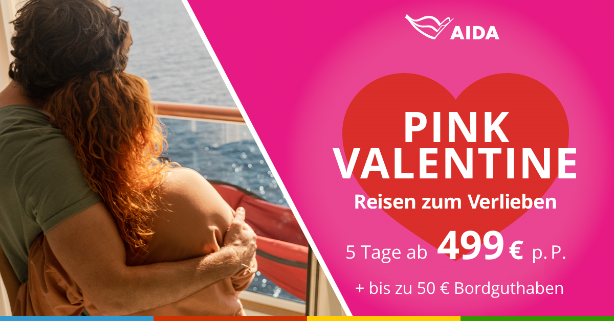 Leinen los für Frühlingsgefühle! Sichern sie sich bei Buchung bis 18.02.2026 mit dem Aktionscode PINKVALENTINE bis zu 50 Euro Bordguthaben für tolle Urlaubsextras!